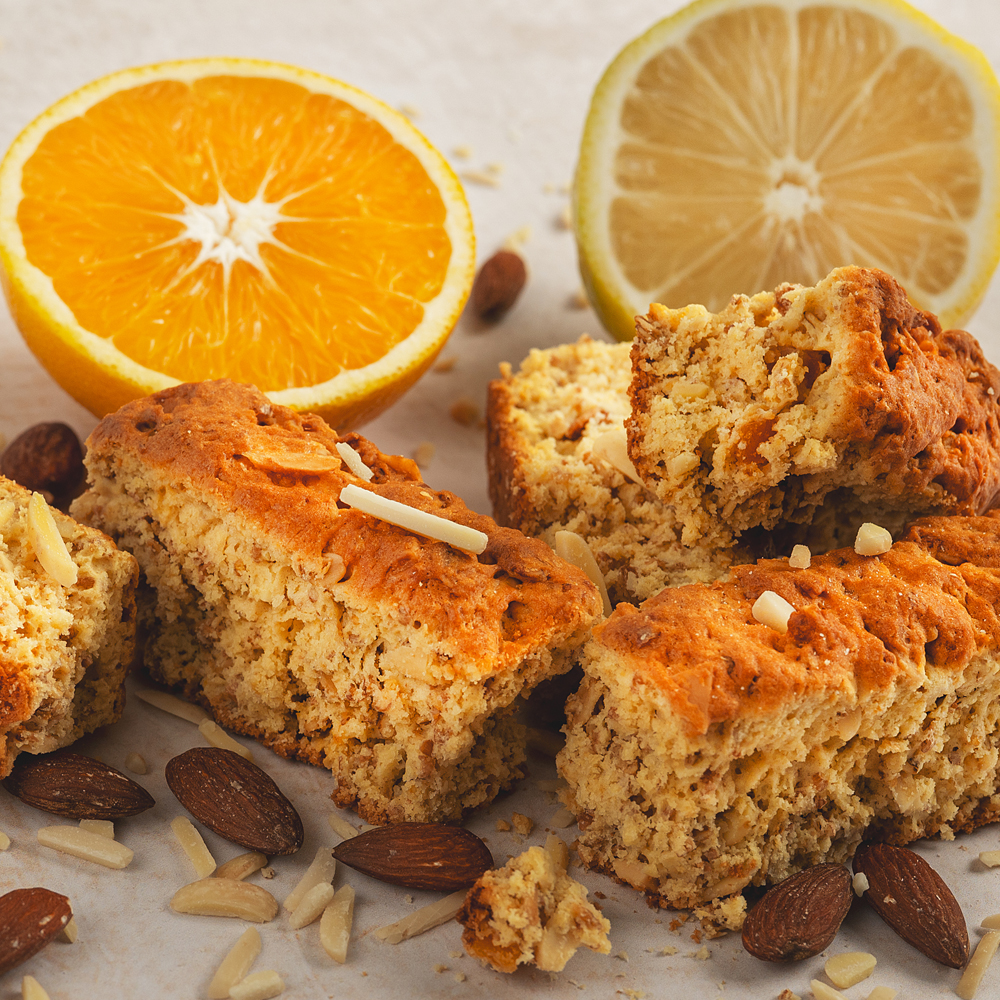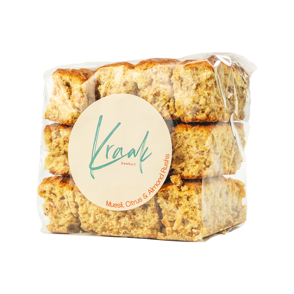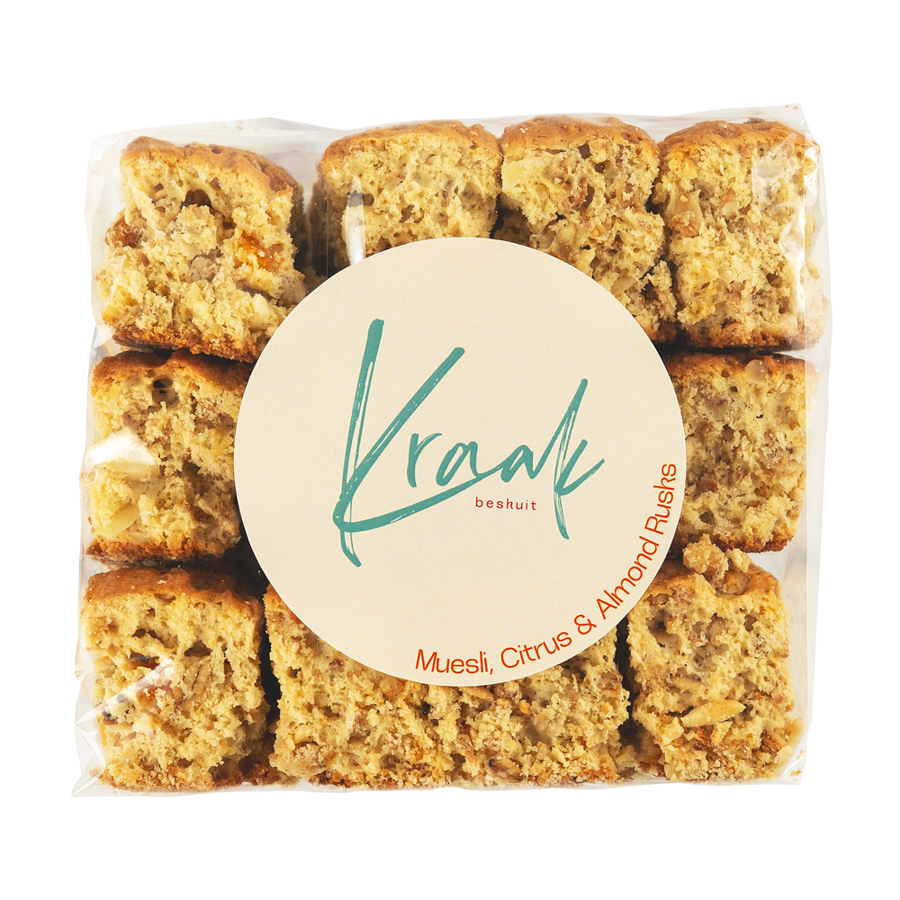 Enjoy a decadent, balanced symphony of flavour and texture — hearty, refreshing, and deeply satisfying. These high-fibre, crunchy rusks combine the wholesome goodness of muesli and the natural richness of almonds, with bright citrus zest adding a refreshing lift. Subtle nutty notes blend with zesty fruit pieces to create warmth and balance, making every bite feel nourishing and uplifting.